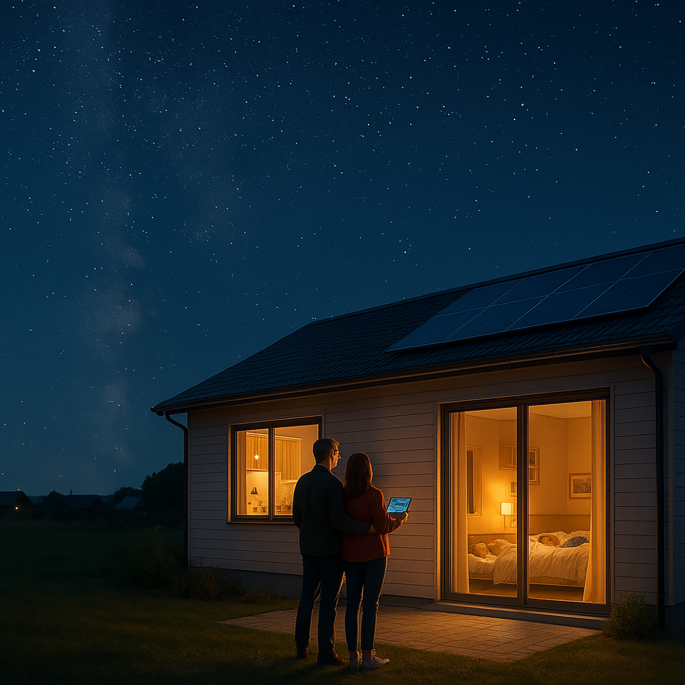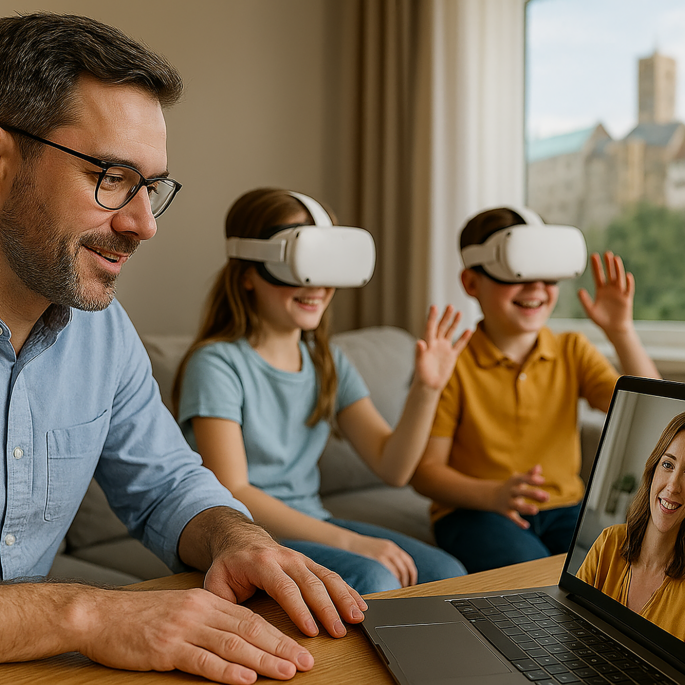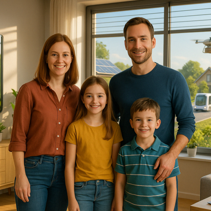 Die Morgensonne weckt die Familie sanft durch intelligente Jalousien und angenehme Musik, abgestimmt auf ihren Biorhythmus. Der Kaffee ist bereits automatisch gebrüht, während Mutter Anna im vorgewärmten Badezimmer Nachrichten vom interaktiven Spiegel erhält. Vater Tom fragt den digitalen Assistenten nach dem Wetter. Die Kinder Emma und Paul haben ihre digitalen Lernmaterialien bereits hochgeladen. Frühstück wird durch eine Drohne geliefert – frische Brötchen und regionale Spezialitäten. Eine Dorf-App zeigt, dass Nachbarin Frau Köhler Eier abzugeben hat. Emma fährt mit einem autonomen Schulbus, Paul nutzt sein E-Bike. Tom bleibt heute im Homeoffice, während Anna per autonom fahrendem E-Auto ins Büro gelangt.